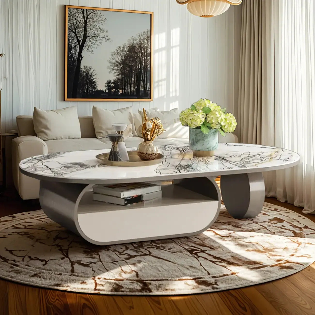 Defined by its distinctive oval form and smooth, striking surface, this table blends artistic presence with thoughtful practicality. The seamless hidden storage ensures both conversation and clutter have their dedicated place.