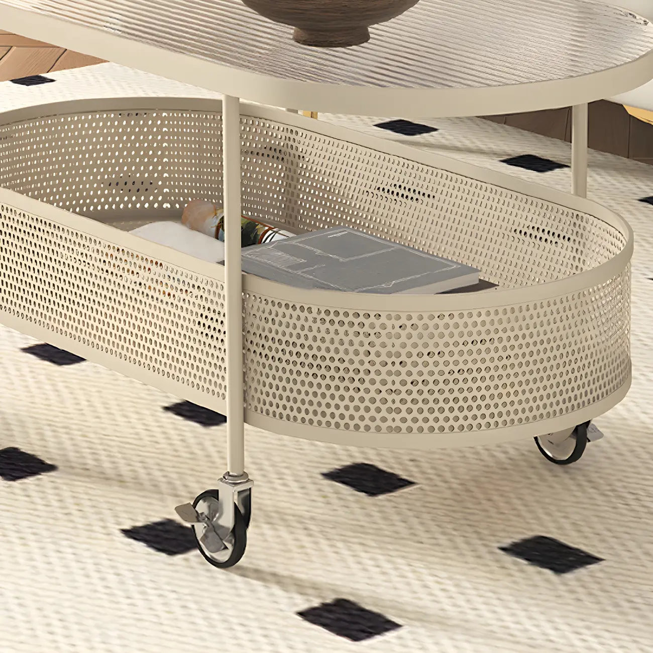 Modern Metal Oval Coffee Table with Storage & Wheels